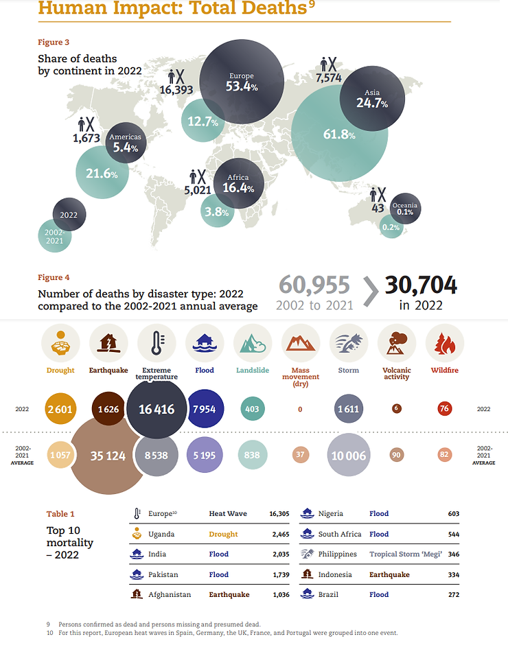 El informe también detalla que la mayoría de las muertes sucedieron en Europa (53,5% del total), motivadas sobre todo por el exceso de mortalidad vinculado con las olas de calor, que afectan especialmente a los adultos mayores, que representan un alto porcentaje de la población del Viejo Continente. Se calcula que 16.305 muertes vinculadas a desastres naturales ocurrieron en territorio europeo, es decir, más de la mitad del total de víctimas mortales mundiales en 2022. Durante el año pasado hubo al menos cinco olas de calor, con temperaturas que alcanzaron los 47 °C.
