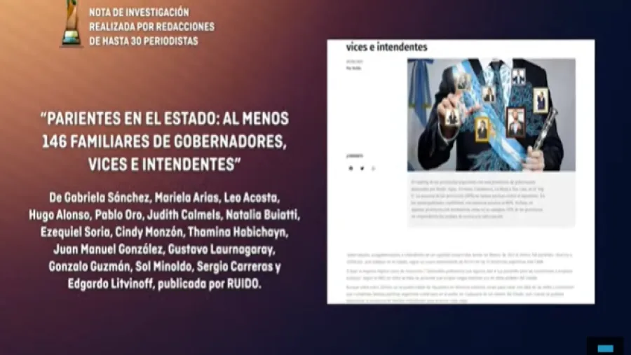 Entre los premiados en la categoría “Nota de Investigación publicada en medios con redacciones de hasta 30 periodistas”, resultó ganador el trabajo “Parientes en el Estado: al menos 146 familiares de gobernadores, vices e intendentes”, de Gabriela Sánchez, Mariela Arias, Leo Acosta, Hugo Alonso, Pablo Oro, Judith Calmels, Natalia Buiatti, Ezequiel Soria, Cindy Monzón, Thamina Habichayn, Juan Manuel González, Gustavo Laurnagaray, Gonzalo Guzmán, Sol Minoldo, Sergio Carreras y Edgardo Litvinoff, publicada por Ruido.