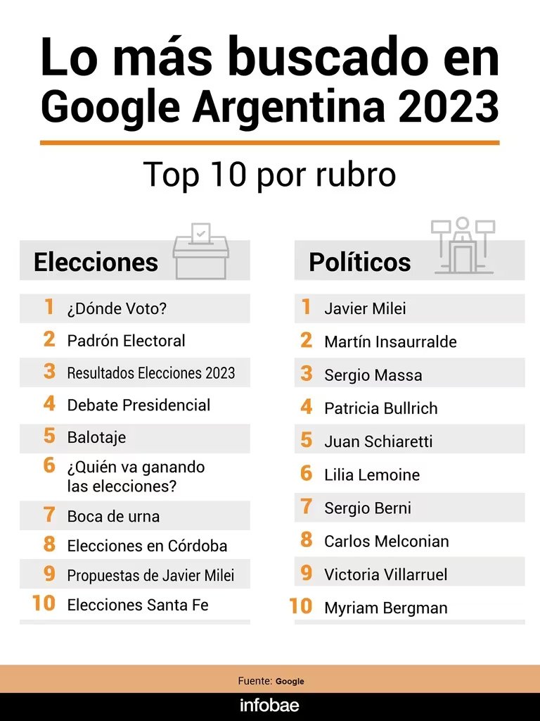 “Los candidatos y actores políticos también tuvieron marcada presencia en el interés de los argentinos. El Presidente Javier Milei encabeza las búsquedas en esta categoría, seguido del ex funcionario Martín Insaurralde y el candidato a Presidente Sergio Massa en tercer lugar. El proceso electoral también estuvo presente en las listas de “¿Qué?” y “¿Cómo?” con consultas como: ¿A qué hora es el debate presidencial?, ¿Qué pasa si no voto?, ¿Hasta qué hora se puede votar?, ¿Cómo saber dónde voto? y ¿Cómo votar?, entre otras, demostrando la utilidad del buscador como fuente de consultas para información de calidad”, informaron.
