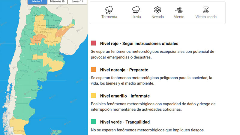El Servicio Meteorológico Nacional (SMN) emitió esta madrugada un alerta amarillo por tormentas que abarca al centro y sur de Entre Ríos, además de otras provincias, en algunas de las cuales (Corrientes, partes de Córdoba y La Rioja) el nivel es naranja, como muestra el mapa.