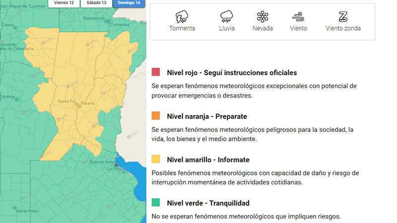 El Servicio Meteorológico Nacional (SMN) emitió en la mañana de este viernes un alerta amarillo por tormentas que afectarían el domingo a gran parte de Entre Ríos, Corrientes, Santa Fe, junto a zonas de Córdoba y Santiago del Estero.