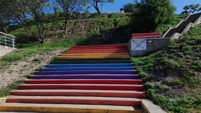A ese espacio, la escalera de la diversidad, Fernández lo inició en la última gestión del intendente Sergio Varisco. “Exacto. Yo le presenté un proyecto y a él le gustó. Me dijo que buscara una escalera que no fuera muy visible. Me ofrecieron algunas pero eran muy perdidas en el parque así que busqué hasta que encontré la que finalmente fue, que tiene 17 escalones y que yo la vinculo con el 17 de mayo que es el Día Internacional contra la Homofobia, la Transfobia y la Bifobia, que es cuando se sacó del listado de enfermedades a la homosexualidad. Dimos vueltas hasta que se compró la pintura y se pintó por primera vez el 18 de septiembre de 2018. Me cansé de pedir ayuda a diferentes sectores del gobierno municipal y provincial para mantener la escalera. Nadie me da bola. Algunas personas aportan plata de sus bolsillos o pongo yo para pintar los escalones. La última ayuda me la dio Lucía Varisco cuando estaba en campaña y después nadie más”, puntualizó.