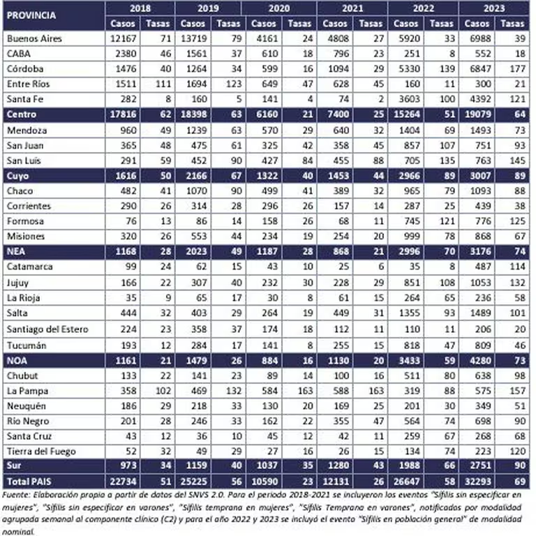 Estos datos se tomaban para establecer la incidencia anual y la información provista por los laboratorios para el monitoreo en cada jurisdicción. Pero a partir de la actualización de las normas de vigilancia en 2022 la vigilancia de sífilis en población general pasa a una modalidad nominal individualizada, integrando información tanto clínica como de laboratorio.