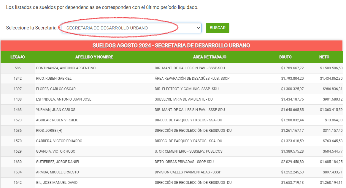 1. La Secretaría de Desarrollo Urbano reconoce 967 empleados. Del área dependen arquitectura, recolección de residuos, obras sanitarias, talleres, depósitos, parques y paseos, puerto, entre otros. El sueldo más alto de agosto fue de 1 millón 743 mil 274 pesos. Hay personal que en agosto, bajo esta dependencia cobró 1000 pesos, pero en sueldos brutos de más de un millón o de más de 500 mil pesos.