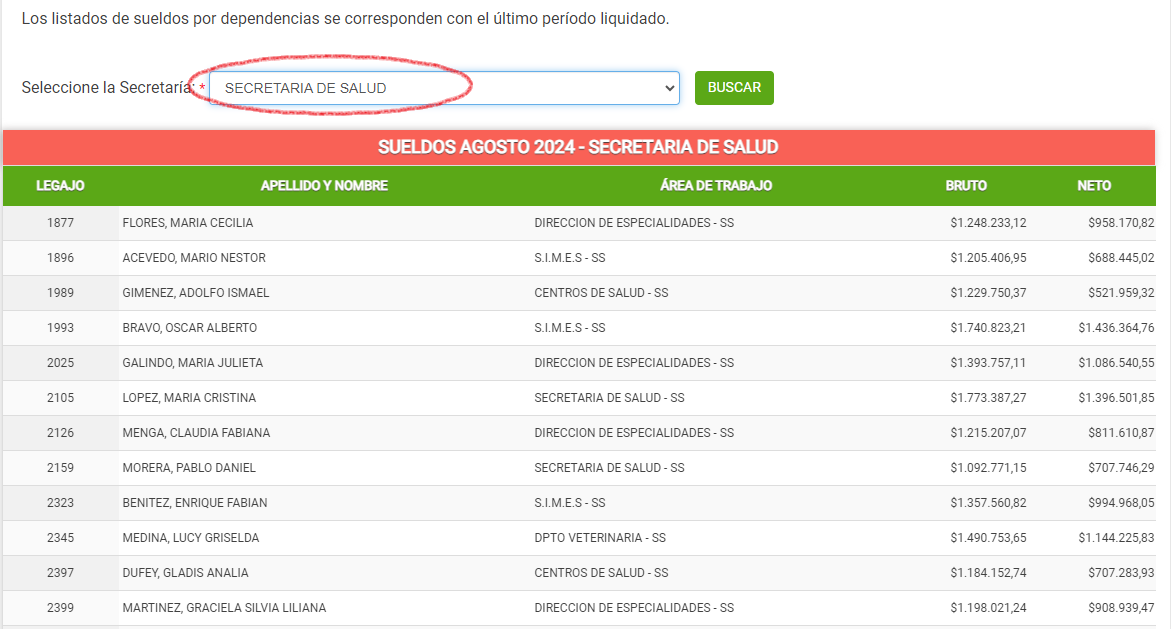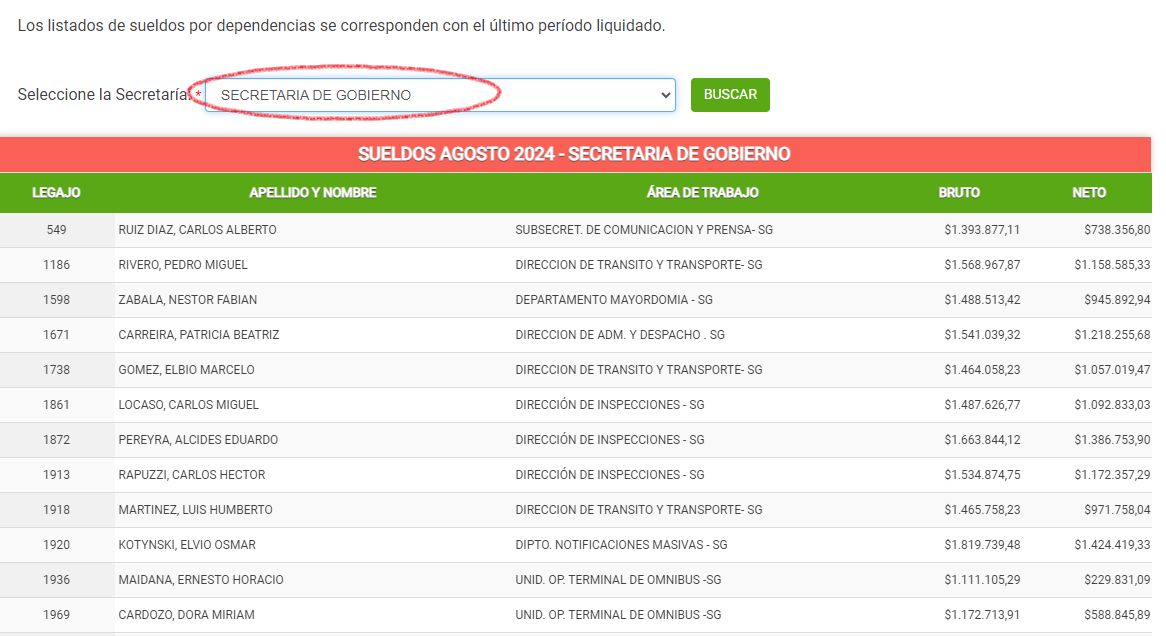 2. La misma información se publica en la Secretaría de Desarrollo Humano de la Municipalidad de Concordia. Es una nómina compuesta por 383 empleados dependientes de distintas áreas como Cultura, Niñez y Adolescencia, Deportes, Desarrollo Social, museos, Logística y Vehículos Livianos, entre otros. El salario más elevado para agosto fue el del secretario de Desarrollo Humano, con 2 millones 340 mil 962 pesos; y el haber más bajo dependiente de la Secretaría fue de 176 mil pesos.