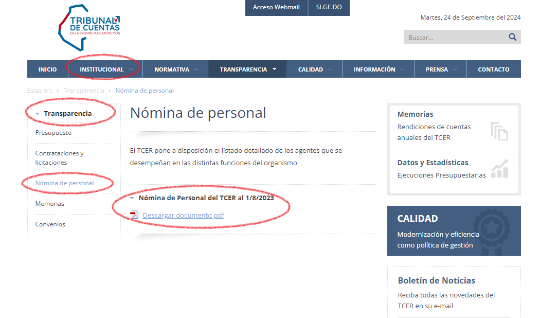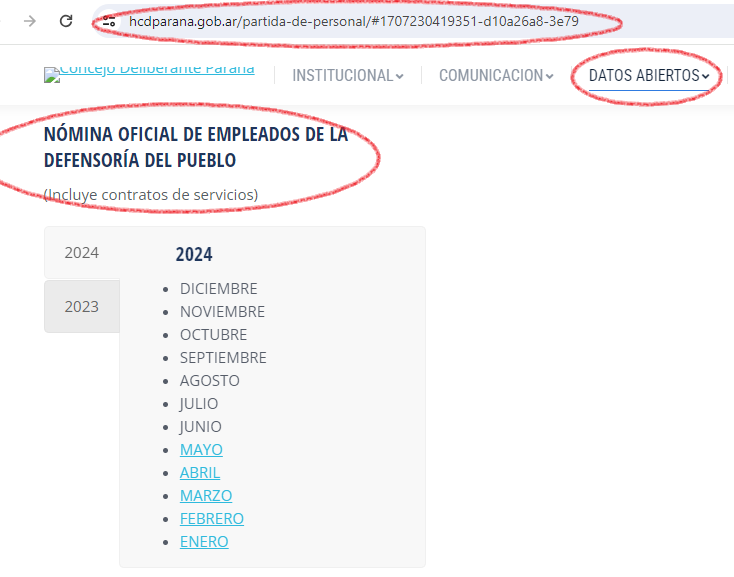 1. Defensoría del Pueblo de Paraná. Sabido es que depende del Concejo Deliberante. Se entra a la página del Concejo. Hay un menú llamado Datos Abiertos que contiene Presupuesto, Pautas Publicitarias, Contratación y Licitaciones, Concursos Administrativos. Entre esos tópicos hay un apartado llamado Partida de Personal. Es necesario ir al pie de página para encontrar el listado de empleados de la Defensoría del Pueblo de Paraná, que informa 19 personas trabajando en el organismo. La última actualización es de mayo de 2024.