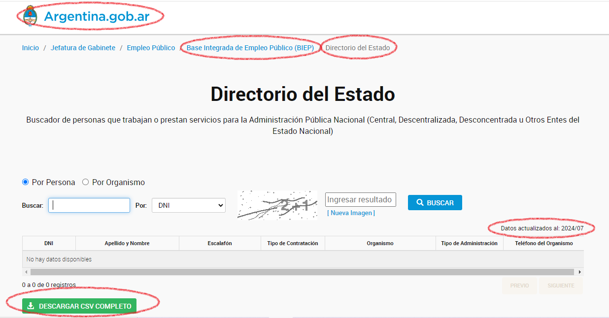 1. De modo amplio, la Administración Central de la Nación, publica el listado de todos sus agentes. Los datos accesibles para cualquier persona, contienen DNI, nombre y apellido, área de trabajo, escalafón y tipo de contratación. Se trata de 423.081 empleados con nombre y apellido, personal de Justicia, Policía, médicos, científicos, fuerzas armadas, organismos de recaudación, todas las dependencias de la Administración Central. La información está disponible en la web. Hay que buscar con el criterio “Base Integrada de Empleo Público (BIEP) / Directorio del Estado”.
