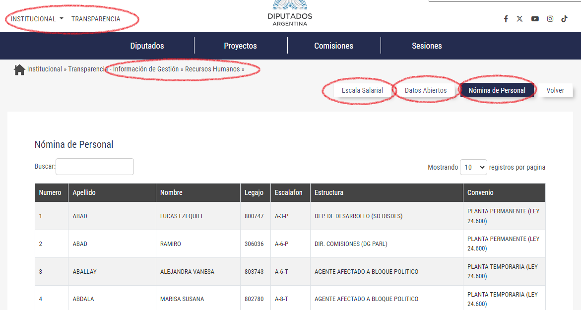 2. Las dos cámaras legislativas de la Nación, tanto el Senado como Diputados, hacen públicos sus registros de empleados. En la web de la Cámara de Diputados de la Nación, en el Menú Institucional/Transparencia/Información de Gestión/Recursos Humanos, se encuentra nómina de personal, escala salarial, composición del personal de la Cámara por género y por franja etaria, un verdadero adelanto. Así es público por ejemplo que de la Cámara baja nacional dependen 4.551 personas. Pero esto quiere decir que están los nombre, los números de legajo, bajo qué modalidad laboral y si dependen de algún legislador. La última actualización es de septiembre.