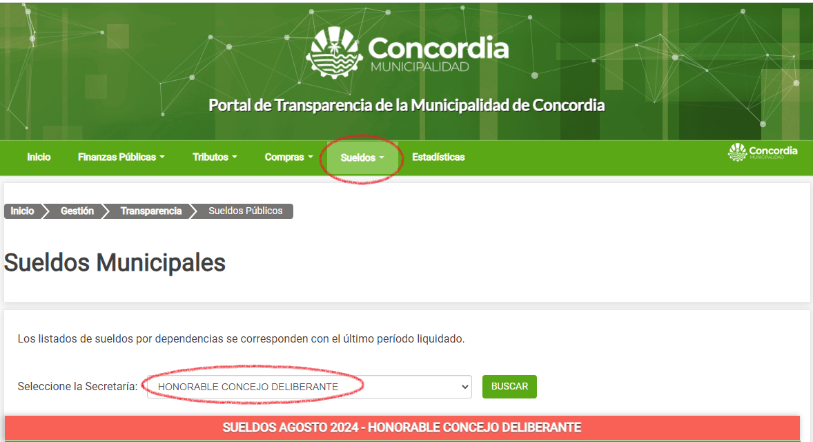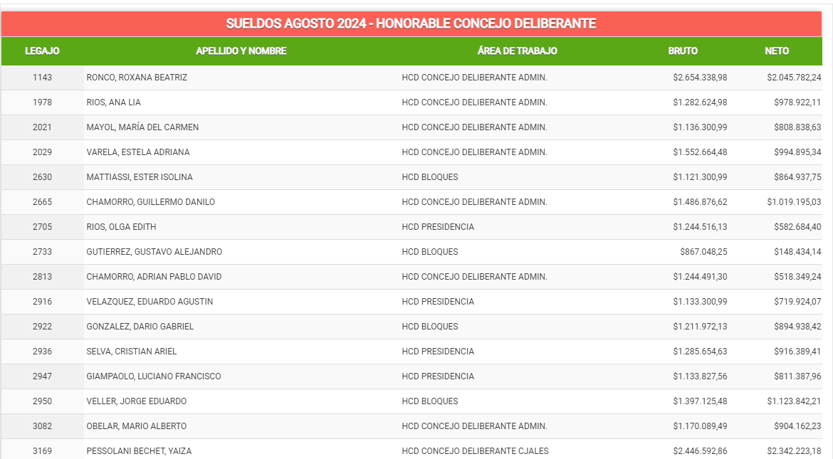 1. El Concejo Deliberante de Concordia, al igual que el de Paraná, también publica el listado completo de empleados, incluida la planta política. Es necesario entrar al Portal Transparencia de la Municipalidad de Concordia. En el menú Inicio / Gestión / Transparencia / Sueldos Públicos se ingresa el criterio Honorable Concejo Deliberante y aparece un listado de 103 personas con nombre y apellido, el área de trabajo, el legajo, el sueldo bruto y el sueldo neto. Puede leerse en ese listado que el sueldo de bolsillo más alto es para la secretaria del Concejo Deliberante, con un haber en agosto de 2 millones 654 mil 826 pesos a los salarios más bajos del Concejo Deliberante que en agosto fueron de 162 mil 540 pesos.