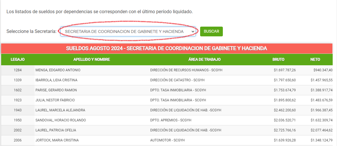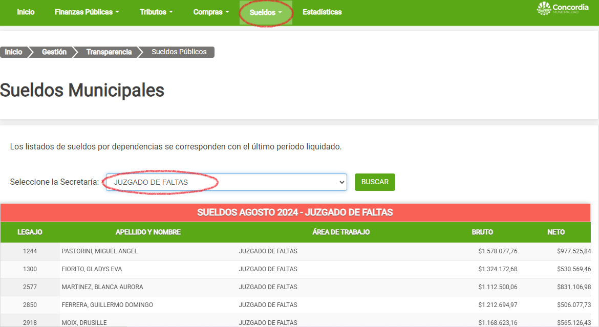 2. La Secretaría de Coordinación de Gabinete y Hacienda de la Municipalidad de Concordia, también publica su nómina de empleados y salarios. En el mismo Portal de Transparencia que venimos mencionando, puede verse el listado de 191 agentes, el área donde se desempeñan y los salarios brutos y netos en agosto pasado. Así puede verse que el haber de agosto más elevado fue para el contador municipal, habiendo percibido 3 millones 158 mil 513 pesos; y el salario más bajo para el sector fue de 310 mil 723 pesos.