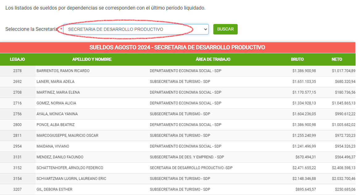 3. La Secretaría de Desarrollo Productivo de Concordia también publica una de lista con sus empleados, áreas a las que responden y sueldos brutos y netos a agosto de 2024. Para esa área, según la información disponible en el Portal de Transparencia Municipal, trabajan 114 empleados. El sueldo más alto en agosto fue el del secretario de Desarrollo Productivo con 2 millones 408 mil 598 pesos, contra el más bajo del sector que en agosto fue de 176 mil pesos.