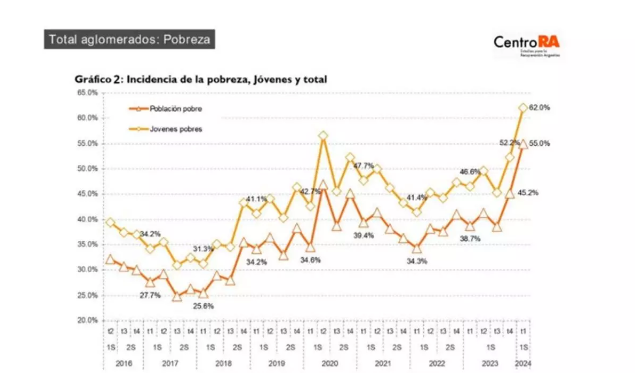 La indigencia en los jóvenes creció más de un 7,2% en los últimos seis meses, ubicándose en el 24,5%. Según afirma el Centro RA, en la tasa de empleo de jóvenes varones y mujeres se pueden observar tendencias inversamente proporcionales en los últimos siete años. Mientras que la tendencia de la empleabilidad de mujeres asciende 4 puntos, el mismo indicador para los varones desciende la misma proporción.