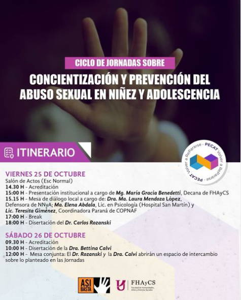 “Volver a re-pararse. Promoviendo acciones para prevenir el abuso sexual en la infancia. Desafíos y alternativas para abordarlo”, es el eje temático sobre el que disertarán Rozanski y Calvi. La actividad forma parte del Proyecto de Extensión de Cátedra (Pecat), llevado adelante por la asignatura Teoría Psicoanalítica (escuela francesa) de la Licenciatura en Psicología de la Facultad de Humanidades, Artes y Ciencias de la Uader, en colaboración con la asociación civil ASI Basta, institución que ha sido recientemente galardonada por el Concejo Deliberante de Paraná.