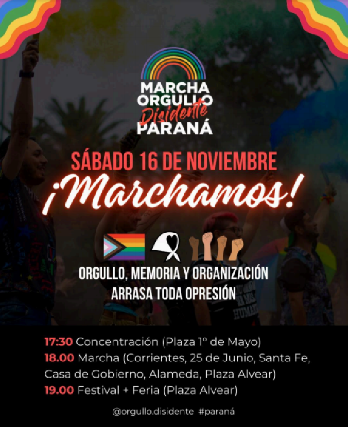 Bajo el lema “Orgullo, memoria y organización contra toda opresión”, invitan a participar de la Novena Marcha del Orgullo Disidente, que se llevará a cabo el sábado 16 de noviembre en Paraná. La concentración será a las 17.30, en Plaza de Mayo. Habrá un recorrido hasta la Casa de Gobierno y cerrará con un festival en Plaza Alvear.