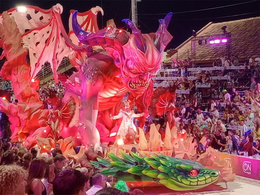 Los espaldares relucientes y las plumas en movimiento crearon un espectáculo visual de gran impacto, complementado por las carrozas que deslumbraron con una iluminación majestuosa. Del mismo modo, fue admirado el paso de los gigantes cíclopes. Se trata de figuras vinculadas con la mitología griega que referencia a unos gigantes con un solo ojo en la mitad de la frente.