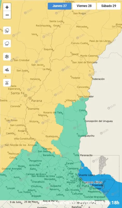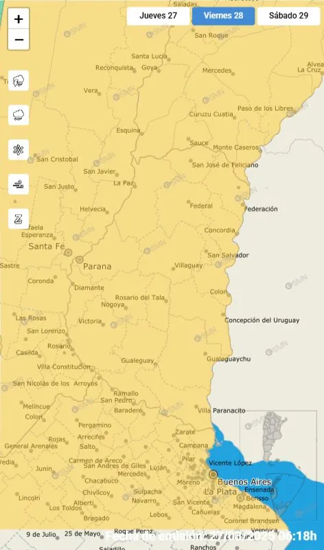 La advertencia para este jueves de mañana incluye a Paraná, La Paz, Diamante, Nogoyá, Villaguay, Victoria, Gualeguay, Concordia, Federal, Feliciano, Federación y San Salvador.