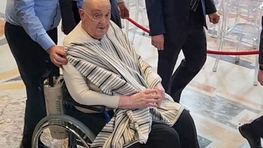 Francisco llegó a la basílica en silla de ruedas y con las cánulas nasales para el oxígeno, alrededor de las 13 hora local (9 de la mañana de la Argentina). Allí sorprendió a un centenar de fieles muy emocionados. Lo que más llamó la atención, sin embargo, fue su atuendo: llevaba una camiseta blanca, pantalones oscuros y un poncho posado a modo de manta sobre el pecho, en una imagen muy diferente de la habitual con el hábito papal blanco.