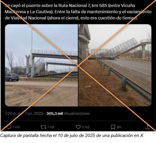 “Se cayó el puente sobre la Ruta Nacional 7, km 585 (entre Vicuña Mackenna y La Cautiva). Entre la falta de mantenimiento y el vaciamiento de Vialidad Nacional (ahora el cierre), esto era cuestión de tiempo”, escribe un usuario en X junto a dos imágenes que muestran un puente peatonal derrumbado.