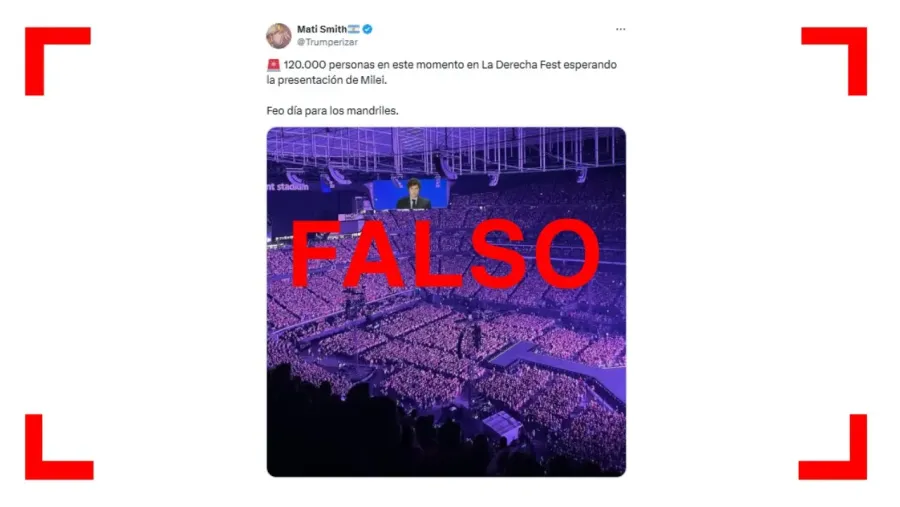 • Pero la foto en realidad fue tomada durante un concierto de la cantante Taylor Swift en Estados Unidos, en 2023. Según reportes periodísticos, al evento libertario asistieron unas 2.500 personas.