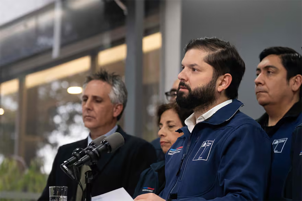 Imagen difundida por la Oficina de Prensa de la Presidencia de Chile muestra al presidente Gabriel Boric hablando desde el Centro Integrado de Operaciones Estratégicas de Codelco en Rancagua, Chile, el 3 de agosto de 2025.