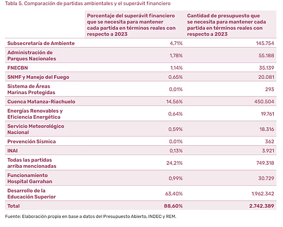 El presupuesto destinado a la deuda pública durante 2025 podría financiar 37 veces el total de las partidas ambientales. Y si el Gobierno así lo estableciera, la mayoría de este tipo de áreas podrían ser cubiertas con una pequeña parte del superávit fiscal, lo que pondría fin al ajuste en los principales organismos de protección ambiental en el país.