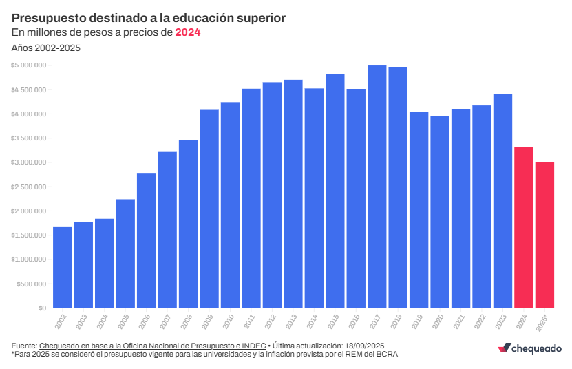De acuerdo con los datos de la Subsecretaría de Presupuesto de la Nación analizados por Chequeado, la gestión de La Libertad Avanza ejecutó la menor inversión en términos reales en educación superior desde 2007.