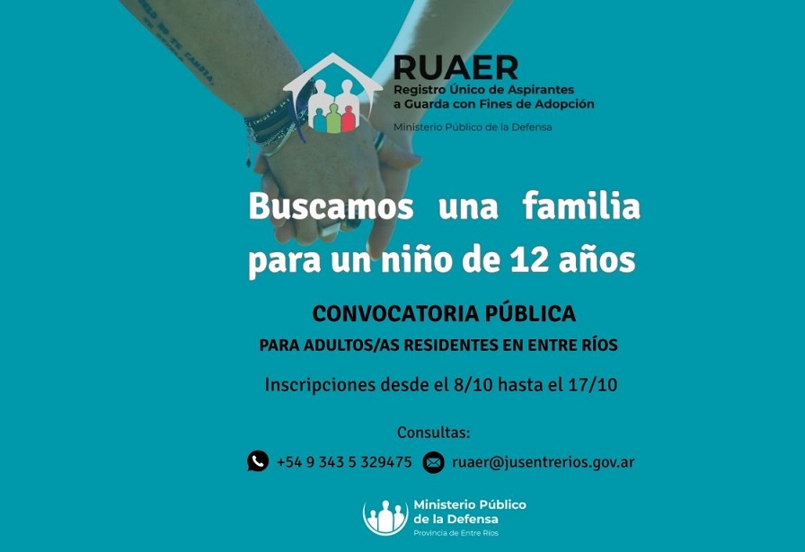 El Registro Único de Aspirantes a Guardas con Fines Adoptivos de Entre Ríos (RUAER) convoca a personas adultas residentes en el territorio de la provincia que se sientan en condiciones de asumir y acompañar la crianza de un niño (A.A.P.) de 12 años, que desea vivir en un contexto familiar.