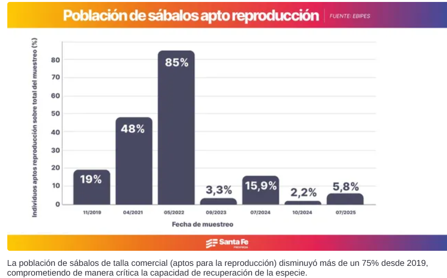 Según los informes Ebipibes, la bajante impactó directamente en la reproducción del sábalo y otras especies, como así también en el crecimiento y supervivencia de ejemplares jóvenes. De acuerdo con los datos obtenidos, la población de sábalos de talla comercial (aptos para la reproducción) disminuyó más de un 75% desde 2019, comprometiendo de manera crítica la capacidad de recuperación de la especie.