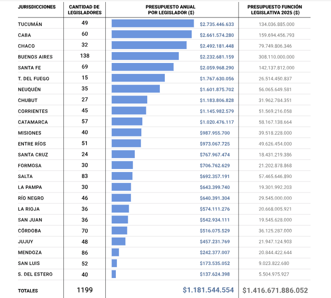 Elaboraron un informe comparativo del costo de las diferentes legislaturas provinciales de la Argentina. Según el ranking que se armó, en la cabeza de lista como los más costosos aparecen los de Tucumán ($2.735 millones anuales estimados por legislador), seguidos por los de la ciudad de Buenos Aires ($2.661 millones), Chaco ($2.492 millones), la provincia de Buenos Aires ($2.293 millones) y Santa Fe.