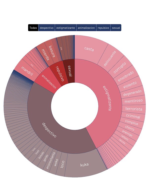 En la anatomía del mensaje se observan varios ejes discursivos. Más de la mitad (54%) contienen adjetivos despectivos hacia otras personas o grupos (“inútil”, “mogólico”, etcétera), como expresiones verbales ofensivas. Asimismo se detectó contenido estigmatizante (“ensobrado”, “mentiroso”, “chorro”, etcétera). La estigmatización es un proceso social más amplio que apunta a etiquetar y marginar a un grupo de personas basándose en prejuicios, que fomentan la discriminación y la exclusión social.