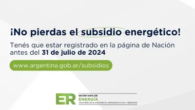 Desde la Secretaría de Energía, a través del Ministerio de Planeamiento, Infraestructura y Servicios, se informa que hasta el 31 de julio, quienes nunca hayan realizado el trámite, deberán completar el formulario de inscripción para no perder los subsidios de luz y gas.