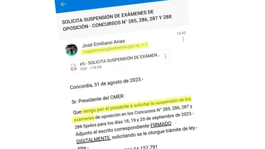 La reacción de Arias ante semejante novedad no se hizo esperar, consignó El Entre Ríos. De inmediato elevó al presidente del Consejo de la Magistratura, Mariano Lino Churruarín, otra solicitud de suspensión de los exámenes de oposición de estos Concursos N°285, 286, 287 y 288, fundada en una nueva razón, explicada en estos términos: