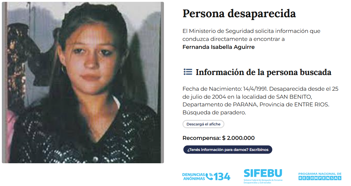 Este viernes 25 de julio se cumplirán 21 años del secuestro y desaparición de Fernanda Aguirre, el caso criminal que más impactó en la historia provincial reciente, la chica que vive en la memoria colectiva entrerriana. Con la recompensa por datos que permitan develar el misterio aún vigente, por 2 millones de pesos, nunca se acabará la esperanza de que alguien diga qué hizo Miguel Ángel Lencina aquella tarde del invierno de 2004 con la chica de San Benito.