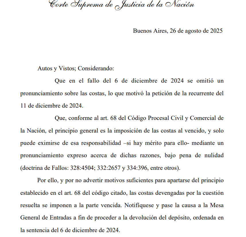 En la resolución firmada por Ricardo Lorenzetti, Horacio Rosatti y Carlos Rosenkrantz, la Corte recordó que, conforme al artículo 68 del Código Procesal Civil y Comercial de la Nación, el principio general es que las costas se imponen a la parte vencida, salvo que existan razones suficientes para apartarse de esa regla, lo que no ocurrió en este caso. Así, el Estado entrerriano deberá asumir todos los gastos del largo proceso.