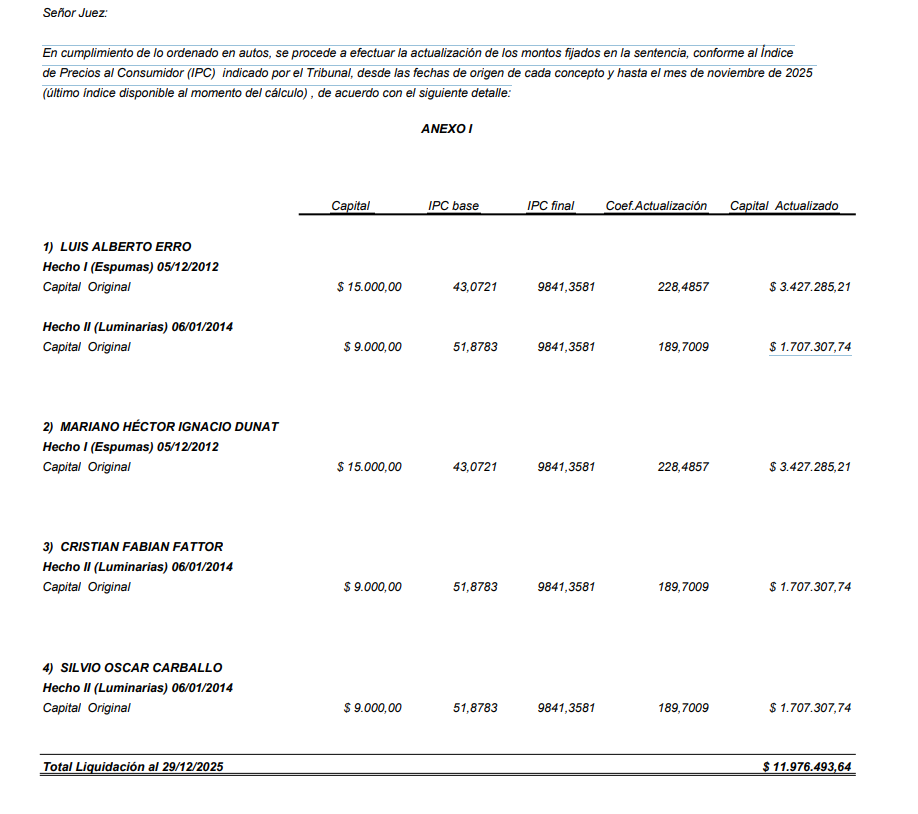 En la sentencia se estableció que todos los condenados efectúen una reparación económica al municipio de Gualeguay. Por esa razón, la Justicia mandó a realizar una pericia contable con el fin de actualizar el perjuicio económico. Estos son los montos actualizados a noviembre de 2025.
