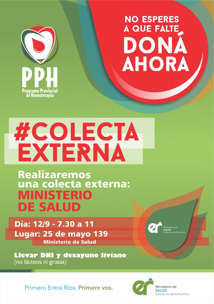 El Ministerio de Salud de Entre Ríos llevará a cabo una nueva colecta externa de sangre. Se trata de la acción que se realizará este jueves frente al edificio situado en 25 de Mayo 139, de Paraná, donde se ubicará un camión sanitario. Quienes quieran donar deben acudir con DNI y habiendo tomado un desayuno liviano (sin lácteos ni grasas).