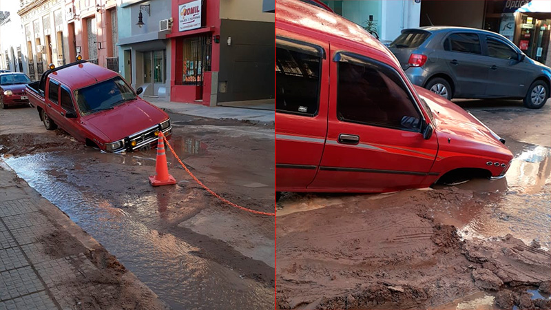 Cabe recordar que esta mañana, una camioneta que circulaba por calle Andrés Pazos, entre Corrientes y San Juan, terminó incrustada dentro de un pozo de grande dimensiones, que se formó en el medio de la cinta asfáltica por la avería del conducto.