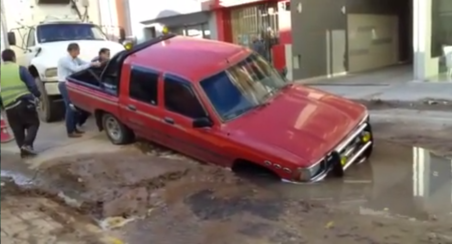 "Había un poco de tierra, agua y nada de señalización. No sé si habrá roto algo, pero es lamentable que ocurra esto y en pleno centro". "No la puedo sacar estoy esperando que venga alguien a ayudarme. Nadie de la municipalidad se ha hecho presente, pero a que estamos a una cuadra", comentó Oscar, quien indicó que iba con su esposa "que la traía a la Caja de Jubilaciones", en dialogo con El Once.
