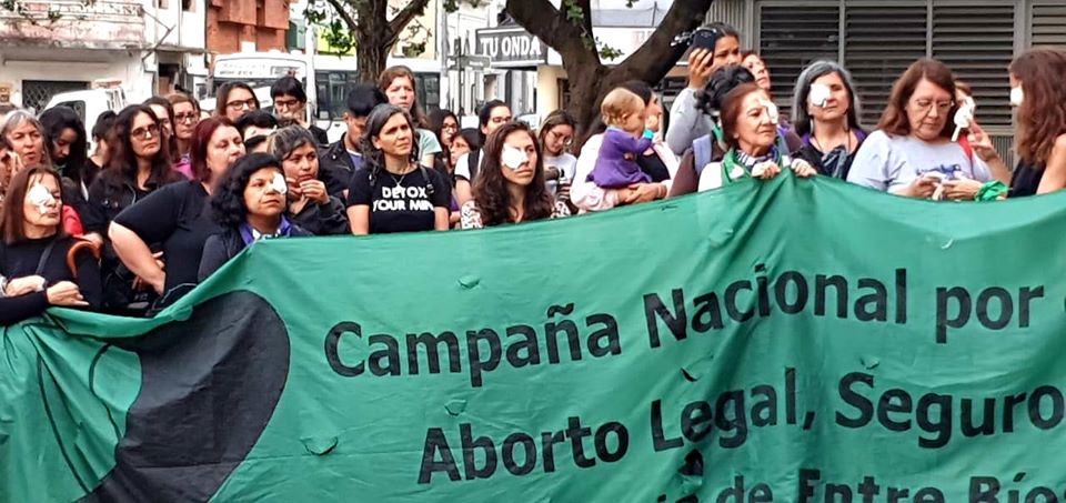 Un grupo de mujeres con un parche en el ojo graficó el reclamo “contra la represión y la violencia en Chile” y con largas polleras negras “en acompañamiento a la lucha de nuestras hermanas bolivianas que están siendo fatalmente masacradas, torturadas y violadas”.