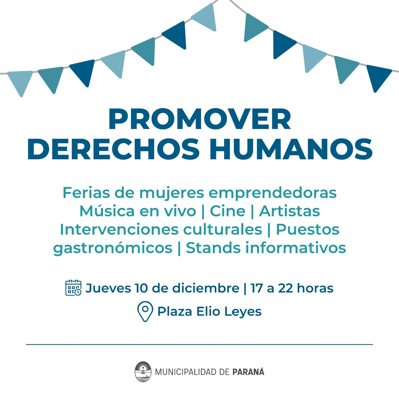 En el marco del Día Internacional por los Derechos Humanos, la Municipalidad de Paraná llevará a cabo una actividad en la Plaza Elio Leyes, que se denomina Promover Derechos Humanos. Será este jueves 10 de diciembre.