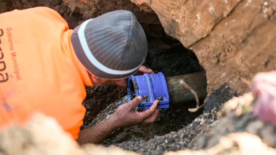 Personal de Obras Sanitarias de Paraná repara un acueducto en calle Echeverría, a metros de Rondeau y por las tareas se debió suspender el abastecimiento de agua potable desde los centros de distribución Lola Mora y Parque del Lago.
