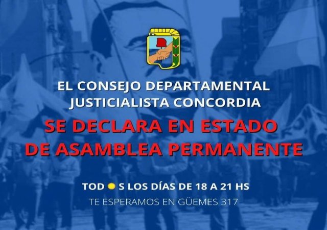 El texto difundido comenzó citando la Segunda Verdad Justicialista: “`El peronismo es esencialmente popular. Todo círculo político es antipopular y, por lo tanto, no es peronista´”, y agregó: “Aunque el PJ de Concordia nunca cerró sus puertas y protagonizó todos los eventos populares en diferentes barrios; a partir de hoy declaramos el estado de asamblea permanente, desde las 18 horas hasta las 21 horas se recibirá a todo aquel o aquella militante que quiera expresarse”.