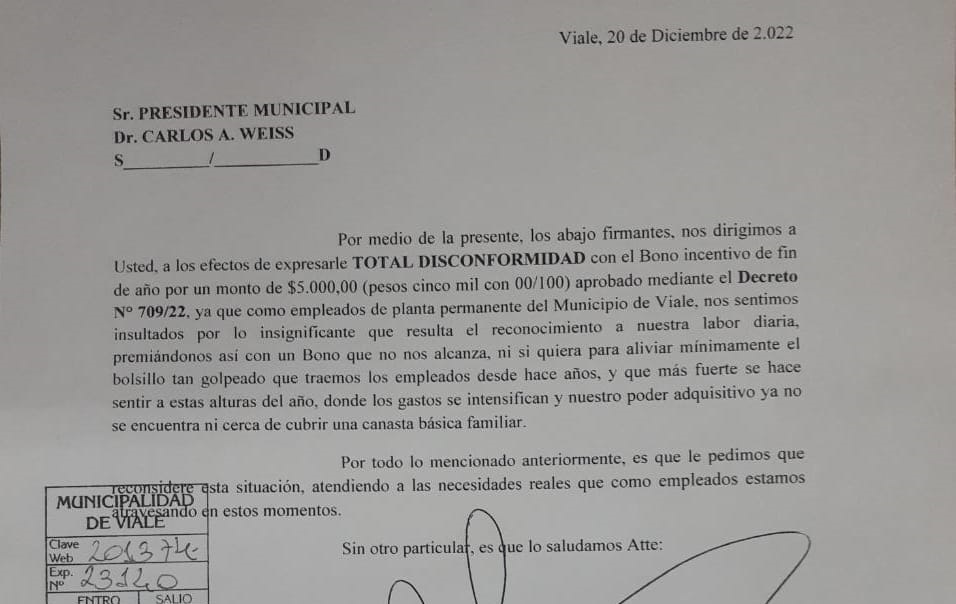 Empleados de la Municipalidad de Viale rechazaron el bono de fin de año de 5000 pesos dispuesto por el Gobierno local que conduce Carlos Weiss. Así se comunicó a ANÁLISIS.