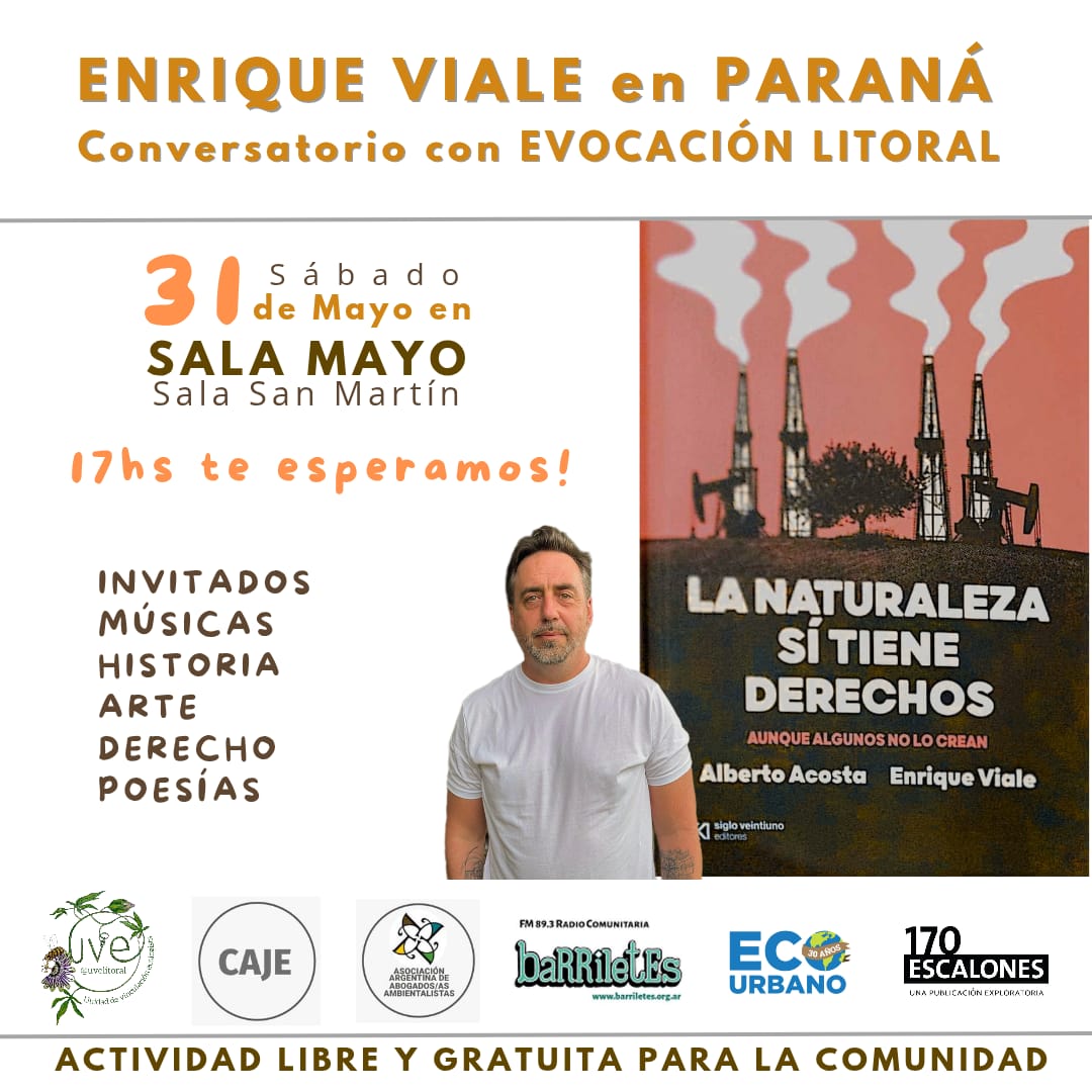 Enrique Viale, presidente de la Asociación Argentina de Abogados/as Ambientalistas, estará en Paraná para presentar su libro “La Naturaleza sí tiene derechos”. Será el sábado, en la Sala Mayo, a las 17.