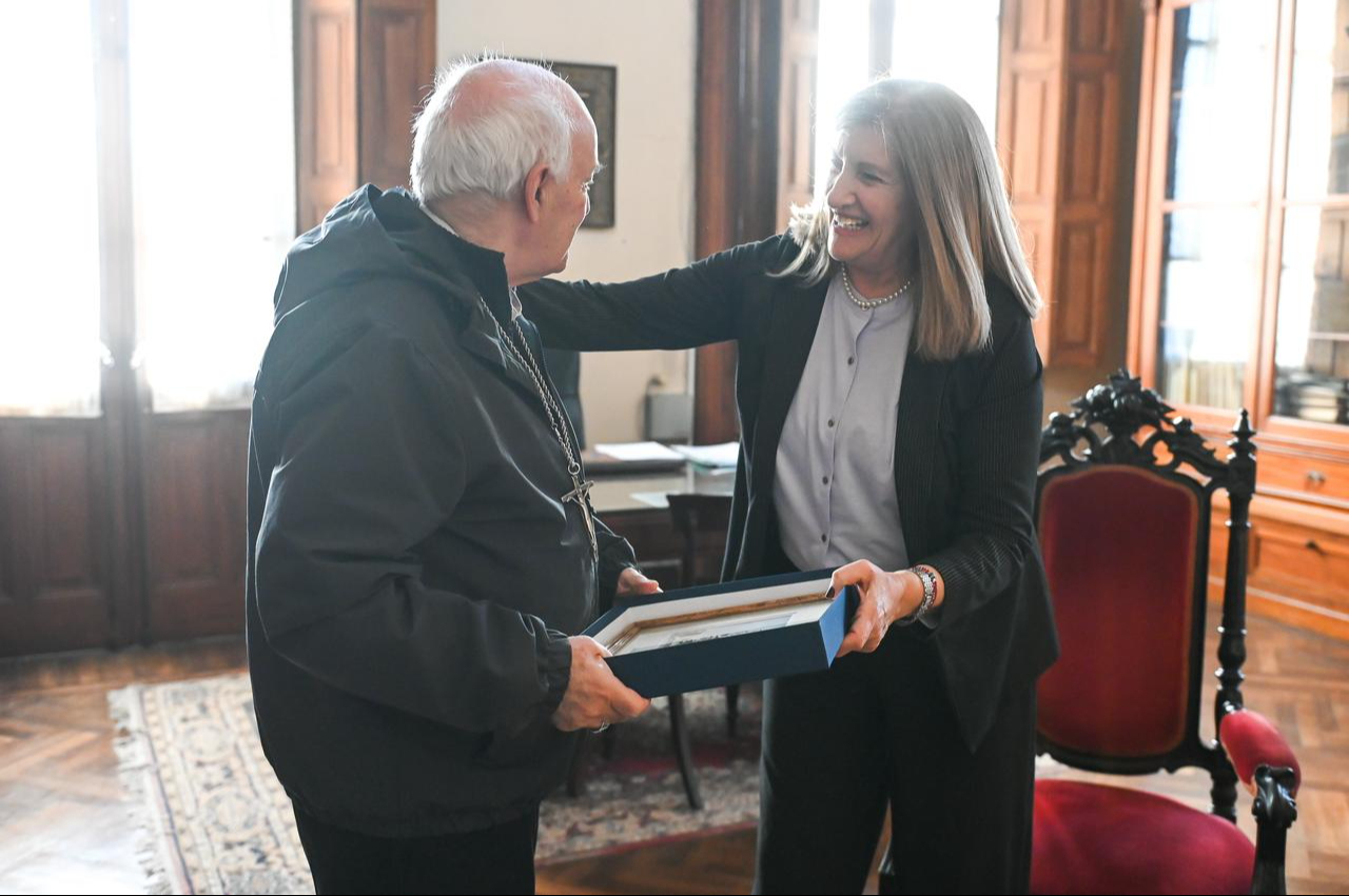 La audiencia institucional se realizó este jueves en la sede del Arzobispado, donde la intendenta Rosario Romero, en representación del Municipio, le obsequió una pintura a monseñor Juan Alberto Puiggari.