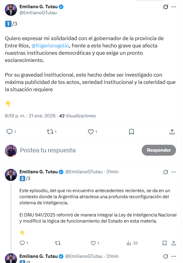 En su mensaje, Gómez Tutau advirtió que el episodio no puede analizarse de manera aislada y lo vinculó con el actual contexto nacional en materia de inteligencia estatal. “Este episodio, del que no encuentro antecedentes recientes, se da en un contexto donde la Argentina atraviesa una profunda reconfiguración del sistema de inteligencia. El DNU 941/2025 reformó de manera integral la Ley de Inteligencia Nacional y modificó la lógica de funcionamiento del Estado en esta materia”, señaló.