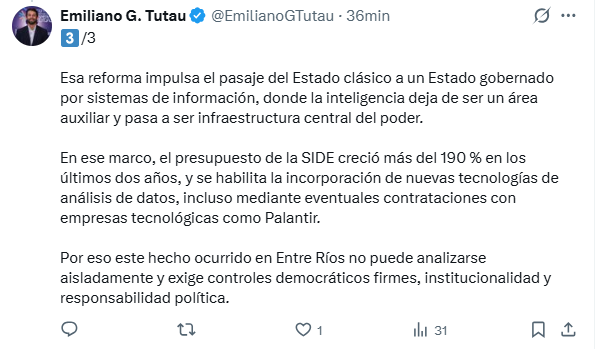 Finalmente, el concejal profundizó su análisis y remarcó la necesidad de controles democráticos firmes frente a los cambios estructurales que se están impulsando. “Esa reforma impulsa el pasaje del Estado clásico a un Estado gobernado por sistemas de información, donde la inteligencia deja de ser un área auxiliar y pasa a ser infraestructura central del poder. En ese marco, el presupuesto de la SIDE creció más del 190 % en los últimos dos años, y se habilita la incorporación de nuevas tecnologías de análisis de datos, incluso mediante eventuales contrataciones con empresas tecnológicas como Palantir. Por eso este hecho ocurrido en Entre Ríos no puede analizarse aisladamente y exige controles democráticos firmes, institucionalidad y responsabilidad política”.