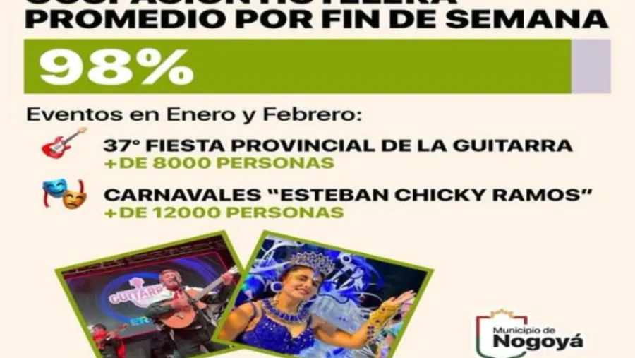 En los meses de enero y febrero, la ciudad de Nogoyá tuvo un importante movimiento de visitantes, que determinó una ocupación hotelera y de cabañas del 98% en promedio durante los fines de semana, se informó desde el municipio local. A eso hay que sumar a quienes pararon en casas particulares y sectores de camping.