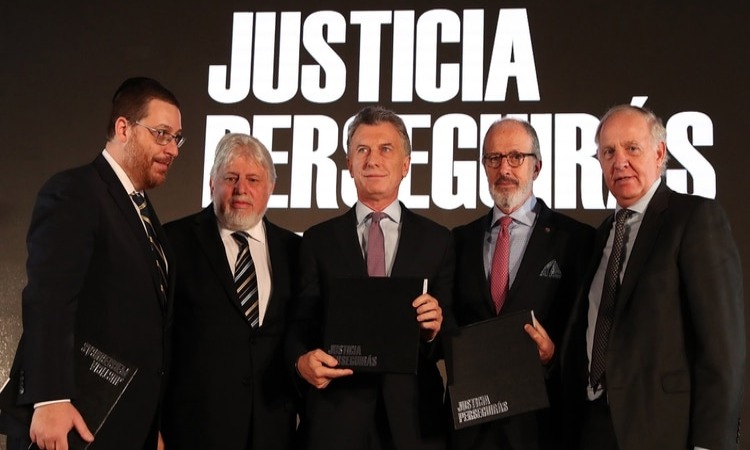 "Vamos a seguir exigiendo que los imputados por nuestra Justicia sean juzgados en suelo argentino, que no se retiren las alertas rojas de Interpol y que ningún país otorgue inmunidad diplomática", dijo este jueves el presidente Mauricio Macri . Fue en el marco del acto homenaje a las víctimas y familiares del atentado a la AMIA, el primero en Casa Rosada a 25 años del ataque y en el marco de la presentación del libro "Justicia Perseguirás", una iniciativa del Congreso Judío Latinoamericano que recopiló textos exclusivos de Donald Trump, Angela Merkel, Jair Bolsonaro y Michelle Bachelet, además del Presidente, entre otros líderes mundiales.