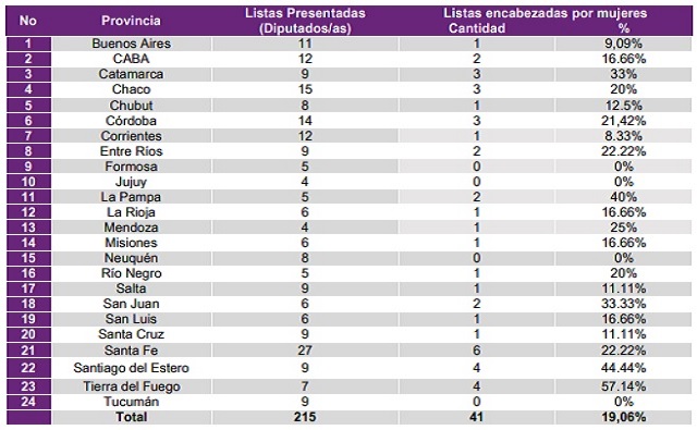 La provincia que presenta una mayor proporción de listas encabezadas por mujeres es Tierra del Fuego, con un 57,14% (cuatro de las siete listas). En el extremo opuesto se encuentran las provincias de Formosa, Jujuy, Neuquén y Tucumán, donde no hay ninguna nómina encabezada por una mujer.